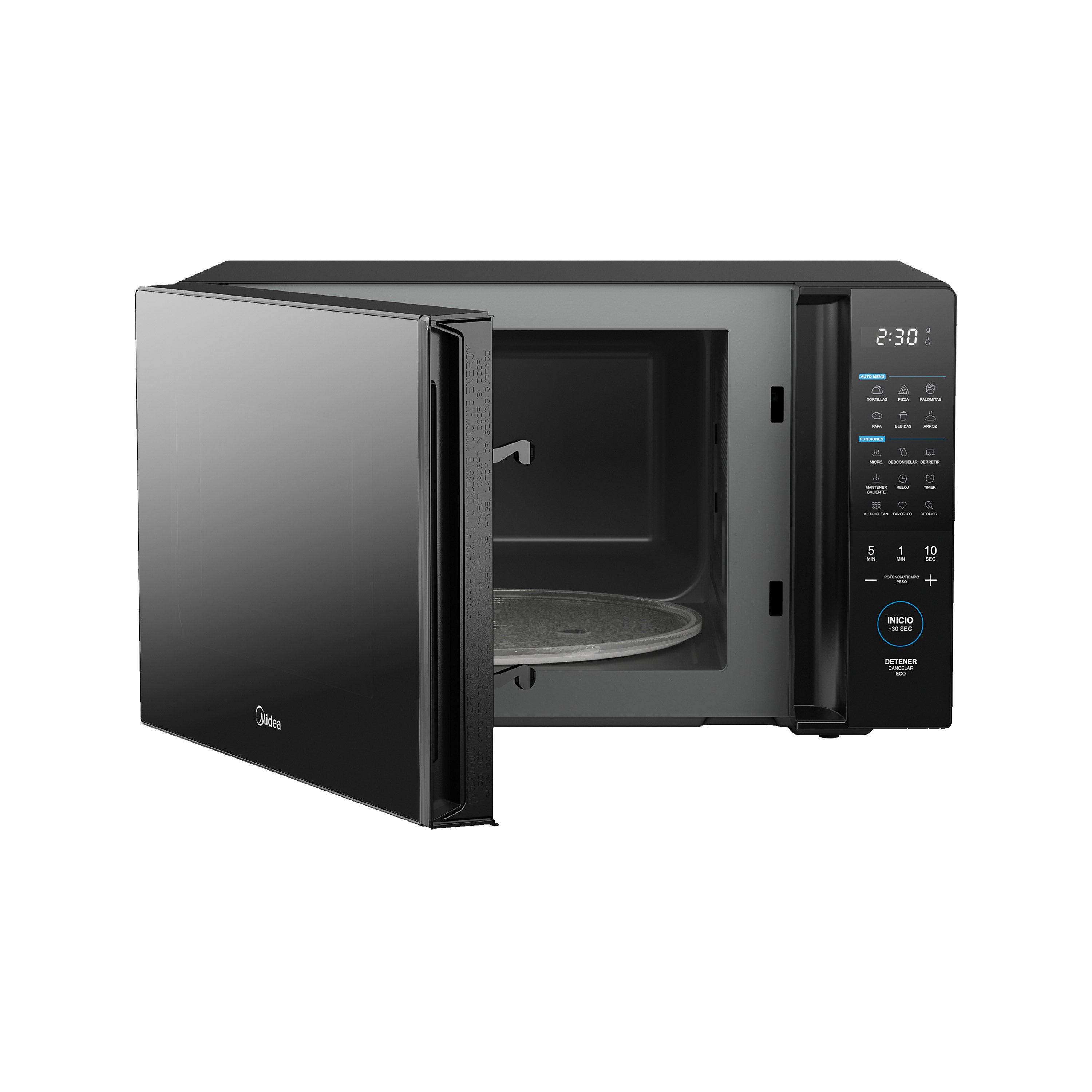 Este microondas 1.4 pies cúbicos ofrece 6 funciones automáticas, 11 niveles de potencia y modo ECO para mayor eficiencia energética. Su diseño incluye una puerta espejo, panel digital LED y cavidad espaciosa. Además, incorpora tecnología AutoClean, función para mantener caliente y deodorizador que elimina malos olores. Ideal para quienes buscan comodidad, estilo y practicidad en su cocina.