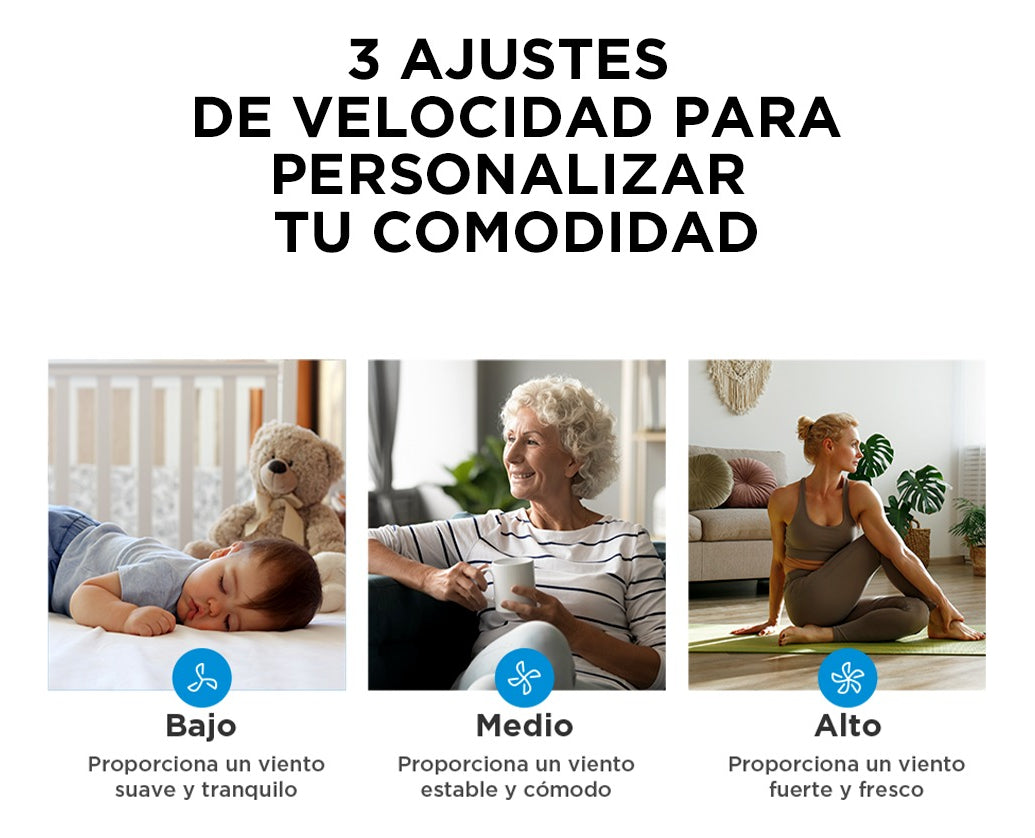 Ventilador Pedestal Air-Booster 16”: Motor 100% cobre Xtreme Trust. Rejilla de metal robusta, temporizador 120 min y 3 velocidades. Diseño patentado de 7 aspas que reduce ruido y aumenta flujo de aire. Pedestal ajustable en altura.